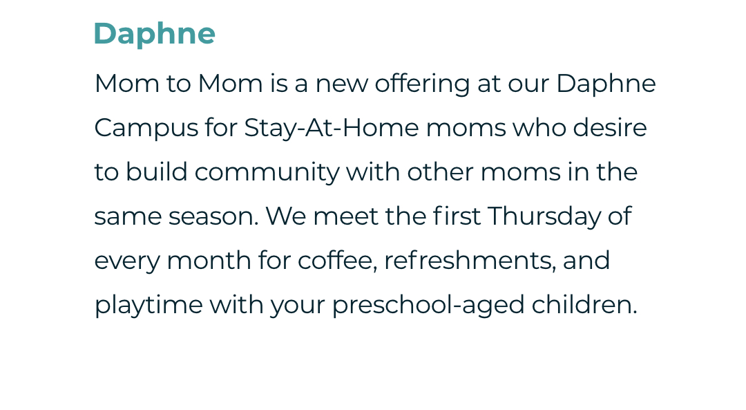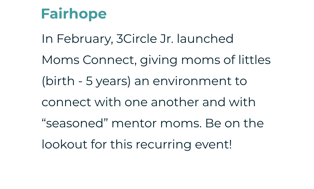 In February, 3Circle Jr. launched Moms Connect, giving moms of littles (birth - 5 years) an environment to connect with one another and with “seasoned” mentor moms. Be on the lookout for this recurring event!